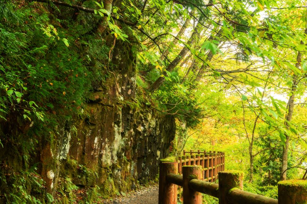 Long ago the mountain path along the gorge was so steep and narrow that people had to embrace each other as they passed. This gave rise to the gorge’s name “Dakigaeri”, meaning “to embrace someone and turn around”. But easy-to-walk footpaths are available now and it has become easy to walk around. It is a scenic spot representing Akita.