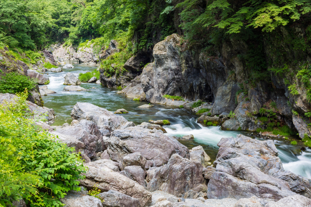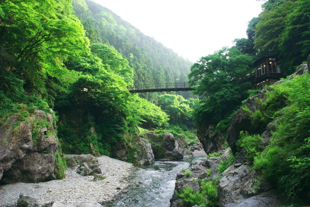 Hatonosu Valley is a spot where you can enjoy a dynamic view, splashing the river and flowing through the Tama River amidst large rocks.
