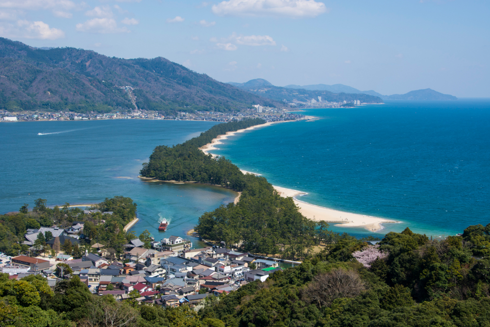 Ama-no-hashidate, située au nord de Kyoto, est l'une des trois vues les plus célèbres du Japon, notamment depuis le parc Kasamatsu que l’on rejoint par un téléphérique. On y admire un tombolo long de plus de 3.6km, est couvert par plus de 8000 pins. Ce pont naturel permet de profiter d’une balade calme et agréable. On le nomme pont du ciel, car si on l’admire la tête en bas en entre les jambes, on a l’impression d’un pont suspendu dans les cieux. Ne manquez pas la visite des temples Chion-ji, temple de la sagesse, dont la construction remonte à l’an 808, et Nariaiji situé en haut de la montagne près du parc Kasamatsu.